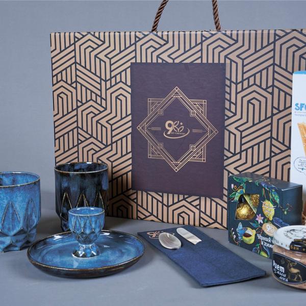 Основу набора составила авторская посуда из керамики ручной работы от эксклюзивного поставщика: тарелка, кружка для чая или кофе, стакан для сока, подставка под яйцо, а также деликатесы: риет из дичи, хлебные палочки гриссини и чай в цедре лимона.