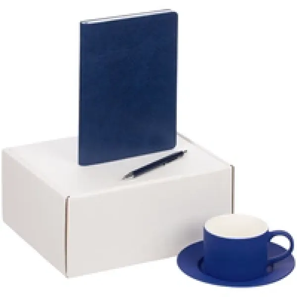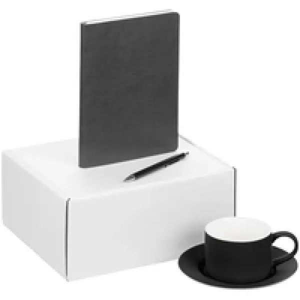 ежедневник - искусственная кожа; чайная пара - фарфор, покрытие соф-тач; ручка - металл; коробка - микрогофрокартон