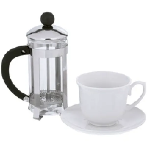 френч-пресс - боросиликатное стекло; нержавеющая сталь; кружка - костяной фарфор