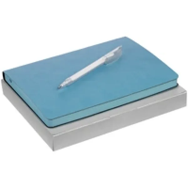 Ежедневник с гибкой обложкой, выполнен из материала Latte, голубой, дополнен ляссе в цвет обложки.