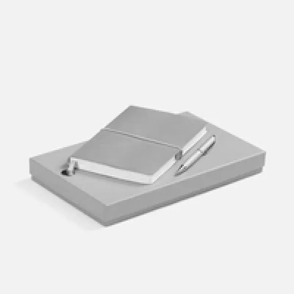 Ежедневник с гибкой обложкой, выполнен из материала Waltz, серебристый DD, дополнен ляссе в цвет обложки с металлическим шильдом.