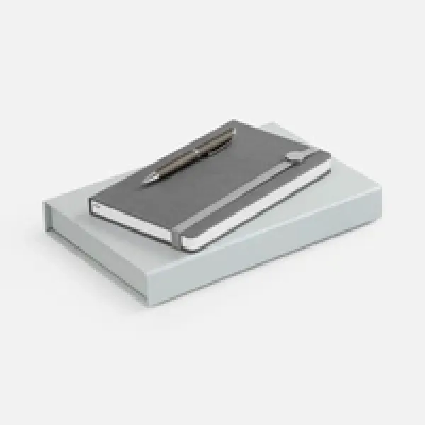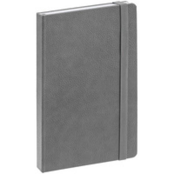 Ежедневник с твердой обложкой, выполнен из материала LaFite, серый СС, дополнен резинкой с металлическим круглым шильдом и ляссе в цвет обложки.