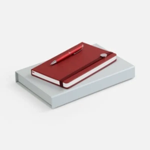 Ежедневник с твердой обложкой, выполнен из материала LaFite, красный РР, дополнен резинкой с металлическим круглым шильдом и ляссе в цвет обложки.