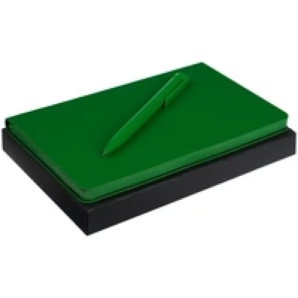Ежедневник с гибкой обложкой, выполнен из материалов Soft Touch Ultra, зеленый FF, и Latte, зеленй (внутренняя часть обложки), дополнен ляссе в цвет обложки с металлическим шильдиком.