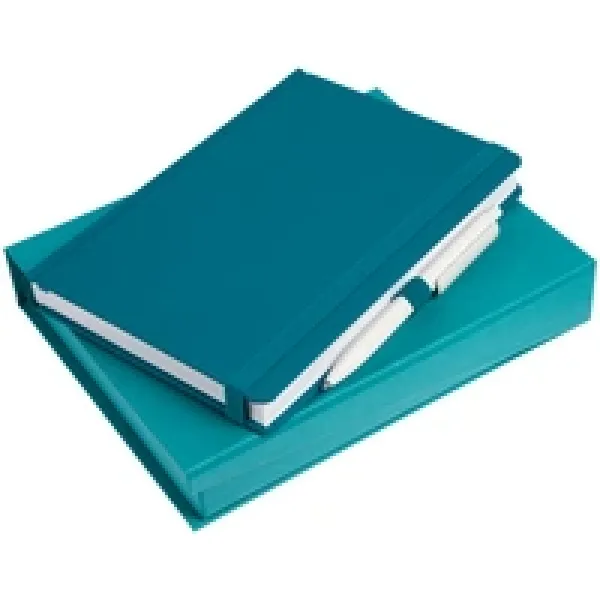 Ежедневник с твердой обложкой без поролона, выполнен из материала Soft Touch, цвет морской волны II, дополнен резинкой шириной 1 см, петлей-резинкой для ручки, капталом и ляссе темно-бирюзового цвета.